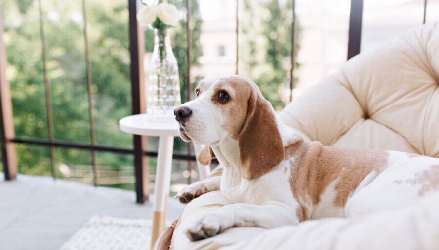 Beautiful photo of graceful beagle dog looking away while resting on balcony beside table with roses. Outdoor portrait of cute puppy lies on white sofa on terrace in summer morning.