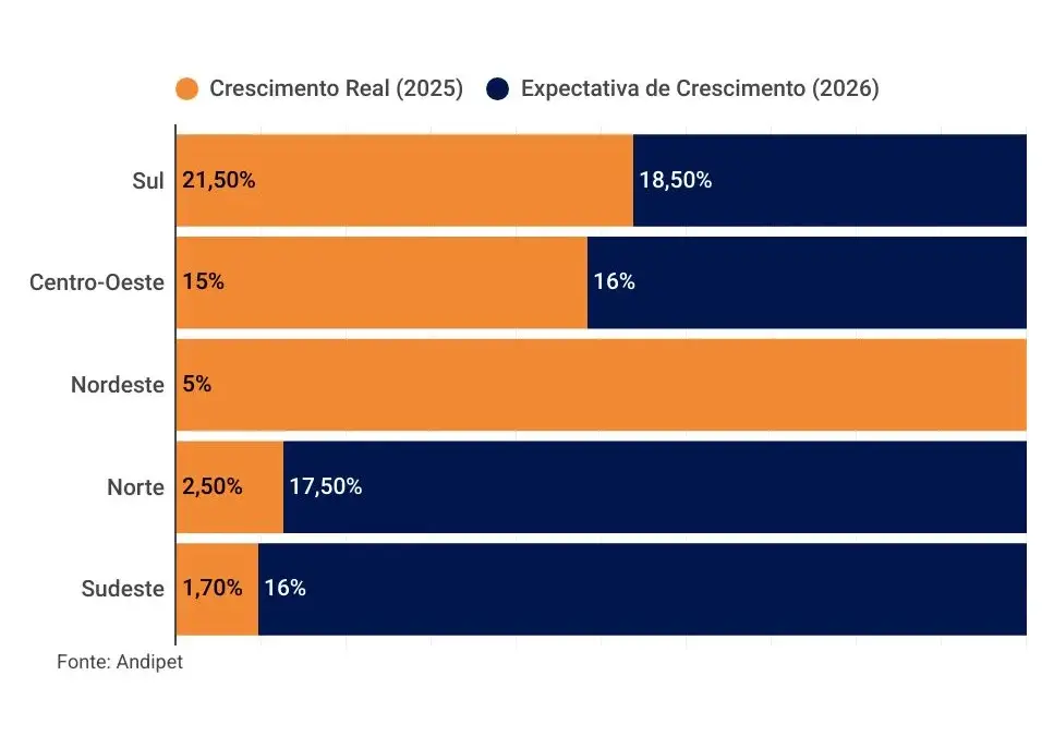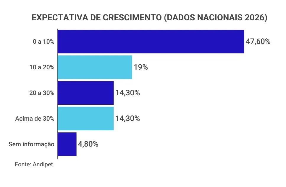 A expectativa de crescimento ou queda para o ano de 2026, conforme mapeado pela Andipet, divide-se da seguinte forma: