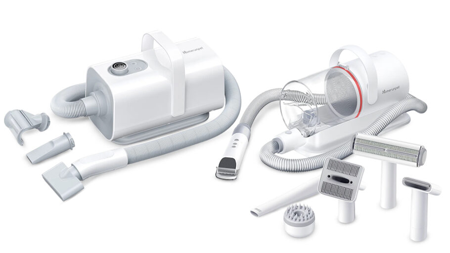 Já o kit Grooming Pet (segunda imagem) agrega uma máquina de tosa e ferramentas para aspiração, escovação e remoção de subpelos. A lâmina de tosa previne sobreaquecimento e cortes acidentais na pele dos animais. Contém ainda botões para ajuste de velocidade e baixo nível de ruído.