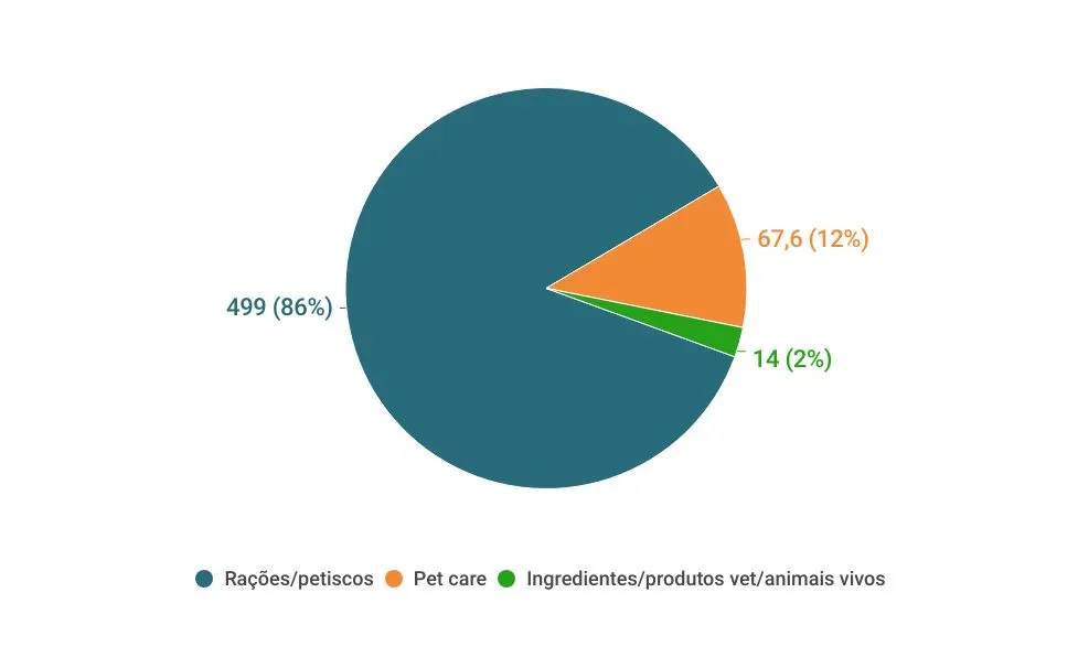 Rações e petiscos representaram 86% das exportações no mercado pet, somando quase US$ 500 milhões (R$ 2,8 bilhões). Em seguida, vêm os produtos de pet care, com US$ 67,6 milhões (R$ 383 milhões e 12%) exportados. Ingredientes, produtos veterinários e animais vivos totalizaram 2%.