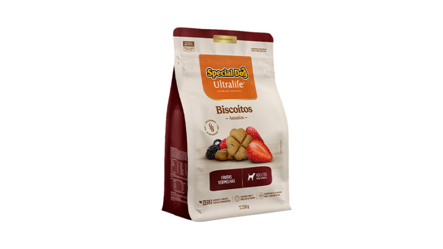 Há ainda o biscoito de frutas vermelhas (250 g). O alimento tem alta quantidade de compostos antioxidantes e vitamina C, disponível tanto para cães adultos como para filhotes.