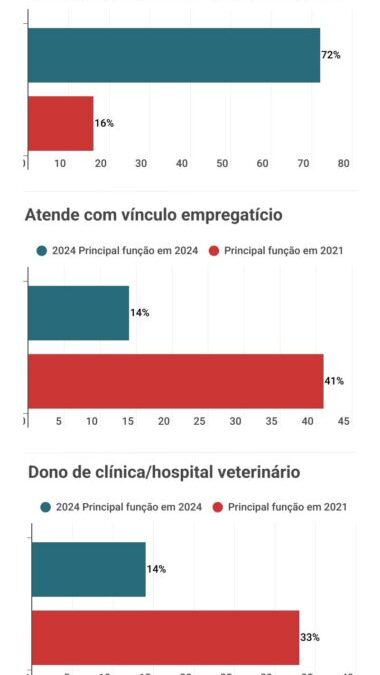 A relação empregatícia no mercado de trabalho para veterinários mudou significativamente durante os anos. Em 2021, 41% dos profissionais tinham como função primária o exercício da veterinária sob um vínculo empregatício. O número de autônomos era pouco superior a um quarto do universo. Já no ano passado, 72% passaram a atuar no modelo autônomo, seja com ou sem contrato de prestação de serviços.