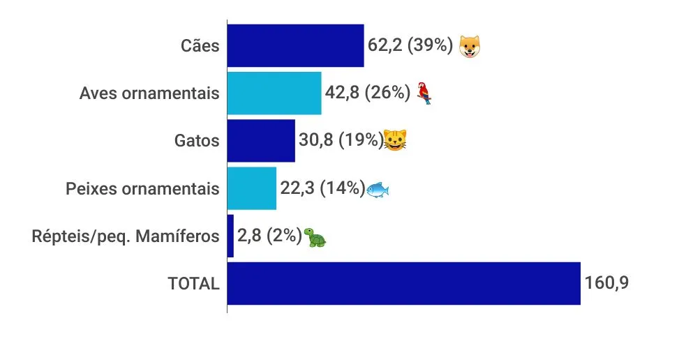 O avanço é superior à procura por cães, cuja alta foi de 2,8% no mesmo período. Embora inferior à média, o incremento de 2,29% de peixes ornamentais – total de 22,3 milhões – também chama a atenção.