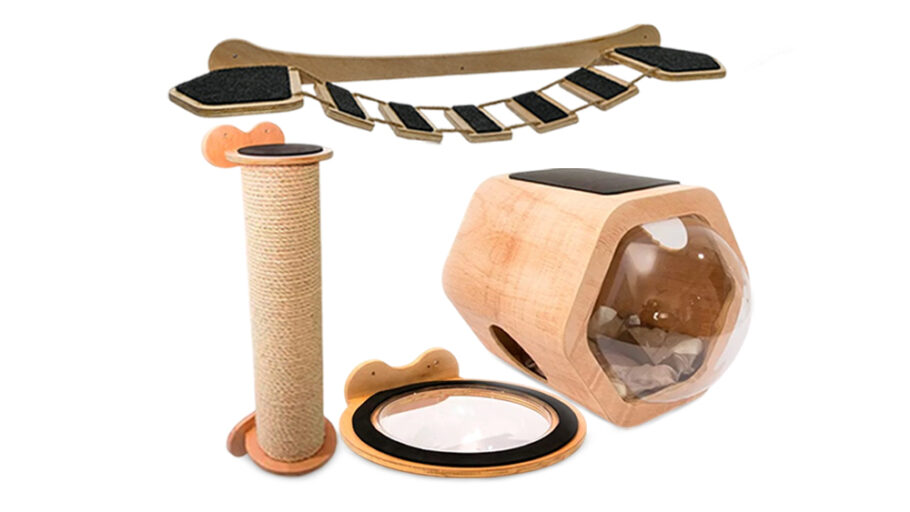 O conjunto Ísis conta com peças fabricadas em madeira, projetadas para atender as necessidades naturais do pet, como casinha suspensa, arranhador fixo, cápsula espacial, rede de descanso, ponte suspensa e cinco degraus para escalada. As peças também são vendidas separadamente.