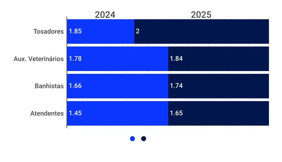 Comparação entre 2024 e 2025 mostra reajustes moderados nas funções operacionais dos pet shops, com maior pressão salarial em grandes centros