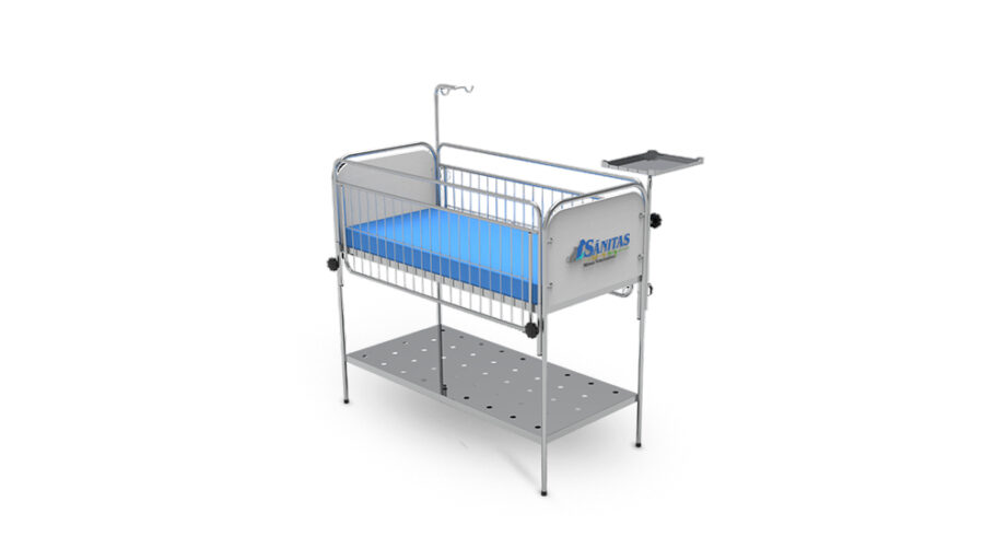 O berço é fabricado em aço inox e conta com grades laterais ajustáveis, que podem ser facilmente levantadas ou abaixadas. Além disso, inclui acessórios como suporte para soro e oxigênio, bandeja removível, colchão confortável e suporte para monitoramento de sinais vitais.