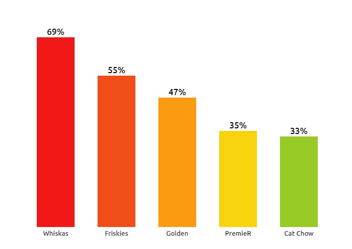 Entre as marcas preferidas para a alimentação dos cães, a campeã é a Pedigree, com 67% de compra entre os tutores. No caso de gatos, a marca mais utilizada é a Whiskas, com 69% de preferência.